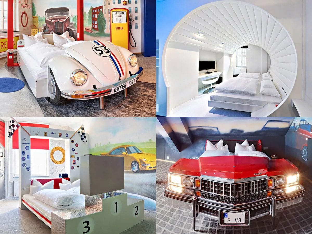 The V8 Hotel offers a unique combination of luxurious comfort and thematic design that will delight any car lover. From beds integrated into real vintage cars to decor inspired by famous automobile classics, each room is a work of art.